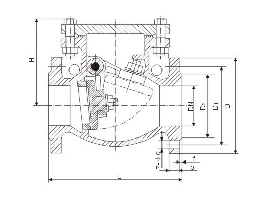 旋启式止回阀的采用内装摇臂旋启式结构,阀门的所有启闭件都装于阀体内部,不穿透阀体,除了中法兰部位用密封垫片和密封环外,整体没有外漏点,杜绝阀门外泄的可能。 旋启式止回阀摇臂和阀瓣连接处采用球面连接的结构,使得阀瓣在360度范围内有一定的自由度,有适当的微量位置补偿。旋启式止回阀已被广泛应用于化工、冶金、制药等多个领域。
